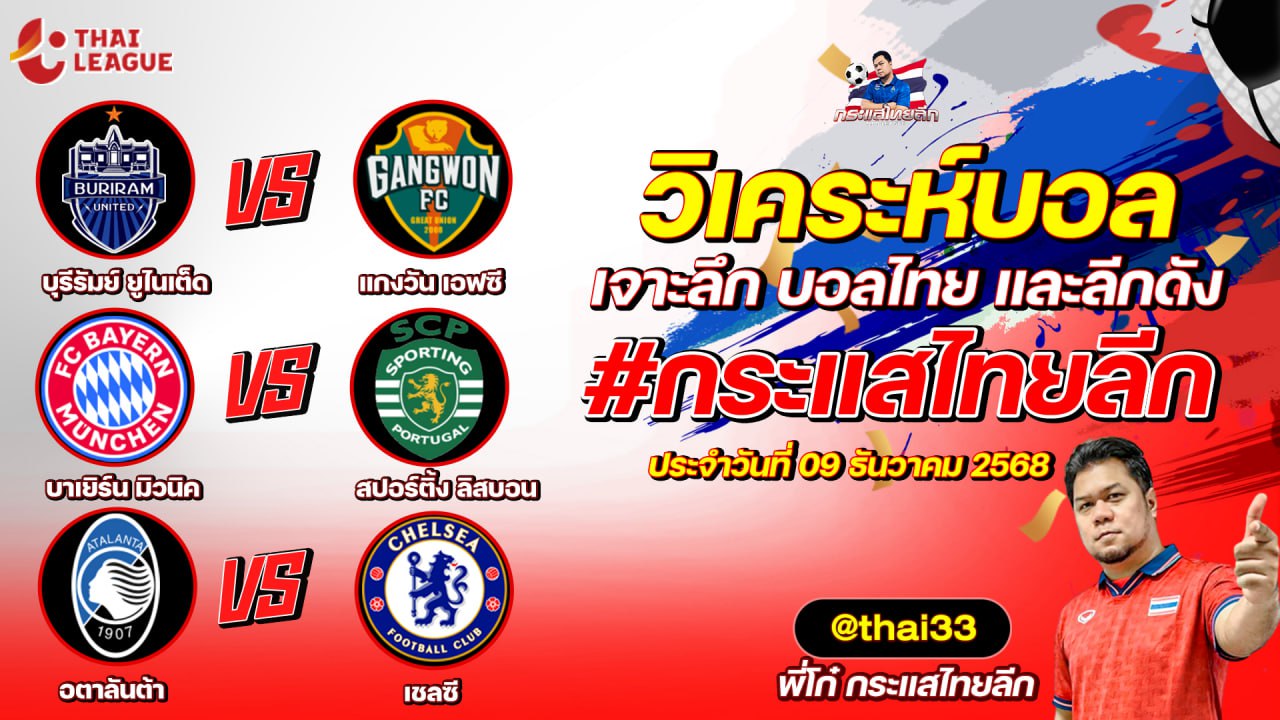 กระแสไทยลีก ทรรศนะบอล 3 คู่ ประจำวันที่ 09/12/2568 รับกระแสไทยลีก ทีเด็ดบอลวันนี้ ทีเด็ดบอลไทย ทรรศนะบอล 3 คู่ กับ พี่โก๋บอลไทย ได้ทุกวันที่ ช่อง กระแสไทยลีก ทีเด็ดบอล 3 คู๋ หน้ากล้อง | วันอังคาร ที่ 09 ธันวาคม 2568 ▁▁▁▁▁▁▁▁▁▁▁▁▁▁▁▁▁▁▁▁▁▁▁ 00:44 | บุรีรัมย์ ยูไนเต็ด VS แกงวัน เอฟซี WEB ADMIN 9 ธันวาคม 2025