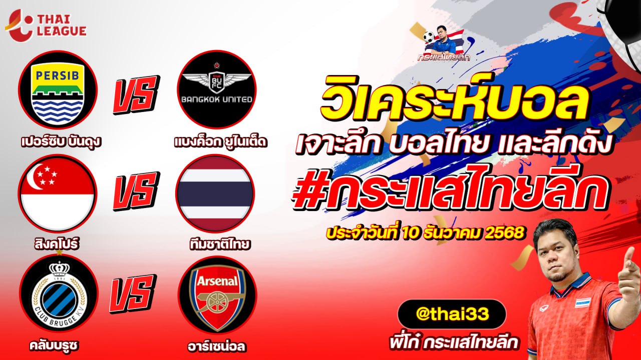 กระแสไทยลีก ทรรศนะบอล 3 คู่ ประจำวันที่ 10/12/2568 รับกระแสไทยลีก ทีเด็ดบอลวันนี้ ทีเด็ดบอลไทย ทรรศนะบอล 3 คู่ กับ พี่โก๋บอลไทย ได้ทุกวันที่ ช่อง กระแสไทยลีก ทีเด็ดบอล 3 คู๋ หน้ากล้อง | วันพุธ ที่ 10 ธันวาคม 2568 ▁▁▁▁▁▁▁▁▁▁▁▁▁▁▁▁▁▁▁▁▁▁▁ 00:40 | เปอร์ซิบ บันดุง VS แบงค็อก ยูไนเต็ด WEB ADMIN 10 ธันวาคม 2025