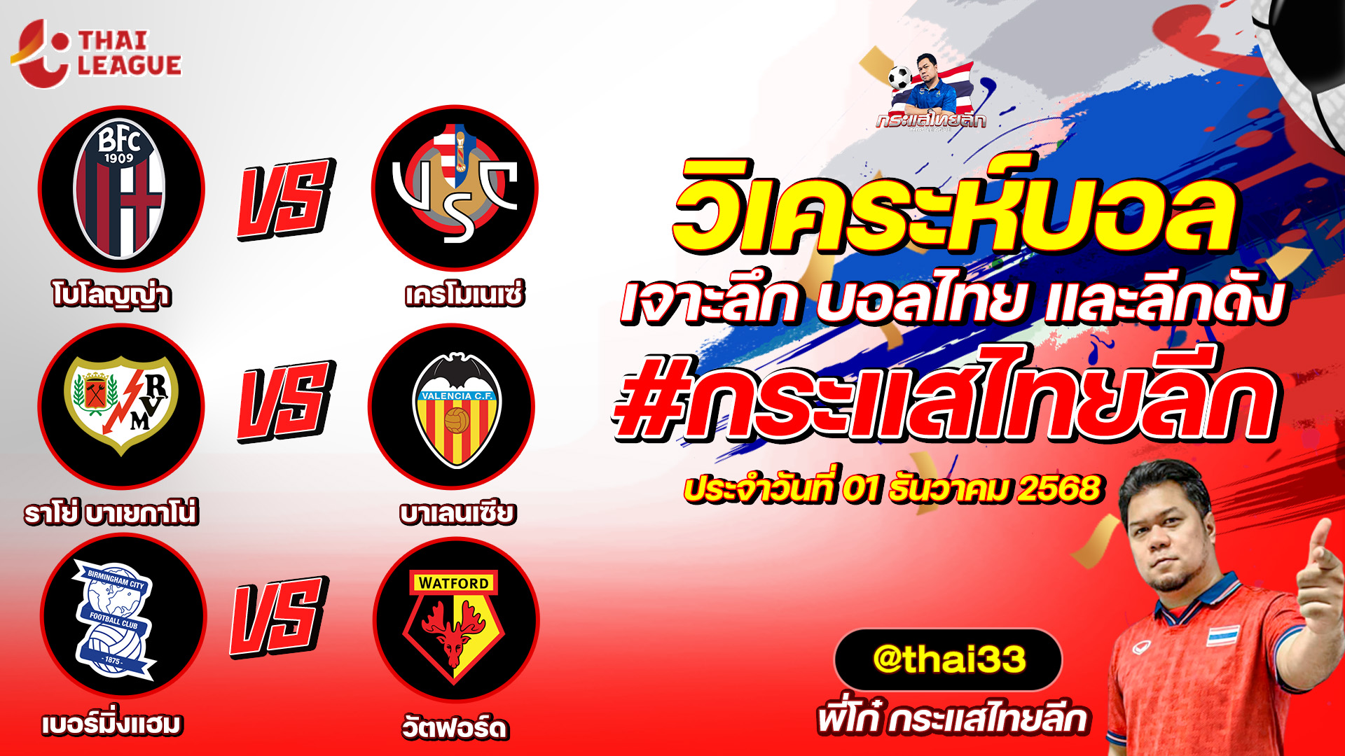 กระแสไทยลีก ทรรศนะบอล 3 คู่ ประจำวันที่ 01/12/2568 รับกระแสไทยลีก ทีเด็ดบอลวันนี้ ทีเด็ดบอลไทย ทรรศนะบอล 3 คู่ กับ พี่โก๋บอลไทย ได้ทุกวันที่ ช่อง กระแสไทยลีก ทีเด็ดบอล 3 คู๋ หน้ากล้อง | วันจันทร์ที่ 01 ธันวาคม 2568 ▁▁▁▁▁▁▁▁▁▁▁▁▁▁▁▁▁▁▁▁▁▁▁ 00:25 | โบโลญญ่า VS เครโมเนเซ่ 02:05 | ราโย่ WEB ADMIN 1 ธันวาคม 2025