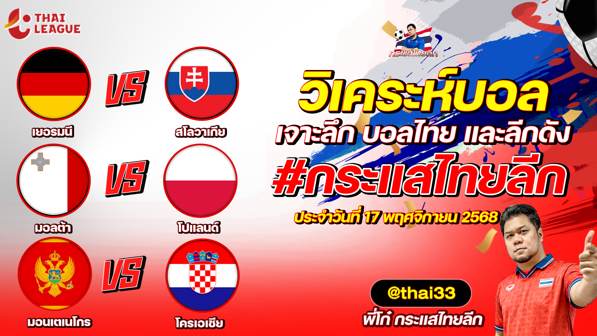 กระแสไทยลีก ทรรศนะบอล 3 คู่ ประจำวันที่ 17/11/2568 รับกระแสไทยลีก ทีเด็ดบอลวันนี้ ทีเด็ดบอลไทย ทรรศนะบอล 3 คู่ กับ พี่โก๋บอลไทย ได้ทุกวันที่ ช่อง กระแสไทยลีก ทีเด็ดบอล 3 คู๋ หน้ากล้อง | วันจันทร์ ที่ 17 พฤศจิกายน 2568 ▁▁▁▁▁▁▁▁▁▁▁▁▁▁▁▁▁▁▁▁▁▁▁ 00:45 | เยอรมนี VS สโลวาเกีย 01:57 | WEB ADMIN 17 พฤศจิกายน 2025