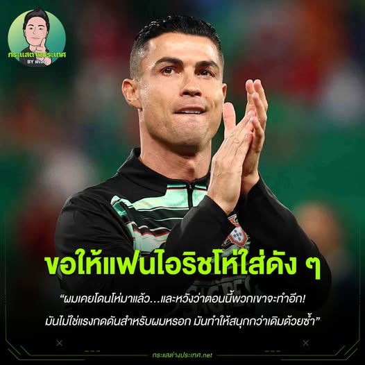 🇵🇹🔥 โด้ท้าชน! ขอให้แฟนไอริชโห่ดัง ๆ จะเอามาเป็นเชื้อไฟพาโปรตุเกสลุยบอลโลก โด้ท้าชน! ขอให้แฟนไอริชโห่ดัง ๆ จะเอามาเป็นเชื้อไฟพาโปรตุเกสลุยบอลโลก คริสเตียโน่ โรนัลโด้ วัย 40 ยังโคตรไฟลุก! ก่อนเกมคัดบอลโลก 2026 ที่โปรตุเกสบุกเยือนไอร์แลนด์ เจ้าตัวยืนยันว่า ยิ่งโดนโห่…ยิ่งดี! เพราะบรรยากาศกดดันคือสิ่งที่เขาชอบและพร้อมเปลี่ยนเป็นพลังบวก ตอนนี้โปรตุเกสต้องการแค่ 1 แต้ม จากเกมที่ดับลิน ก็จะการันตีตั๋วรอบสุดท้ายทันที แต่โด้บอกเลยว่าเกมนี้อยากให้แฟนบ้านเขาใส่มาเต็ม ๆ โด้พูดแบบชัด ๆ ในงานแถลงข่าวว่า: “ผมเคยโดนโห่มาแล้ว…และหวังว่าตอนนี้พวกเขาจะทำอีก! มันไม่ใช่แรงกดดันสำหรับผมหรอก มันทำให้สนุกกว่าเดิมด้วยซ้ำ” เขายังมองว่าเกมนี้น่าจะคล้ายแมตช์นัดแรกที่ลิสบอน (โปรตุเกสชนะ WEB ADMIN 13 พฤศจิกายน 2025