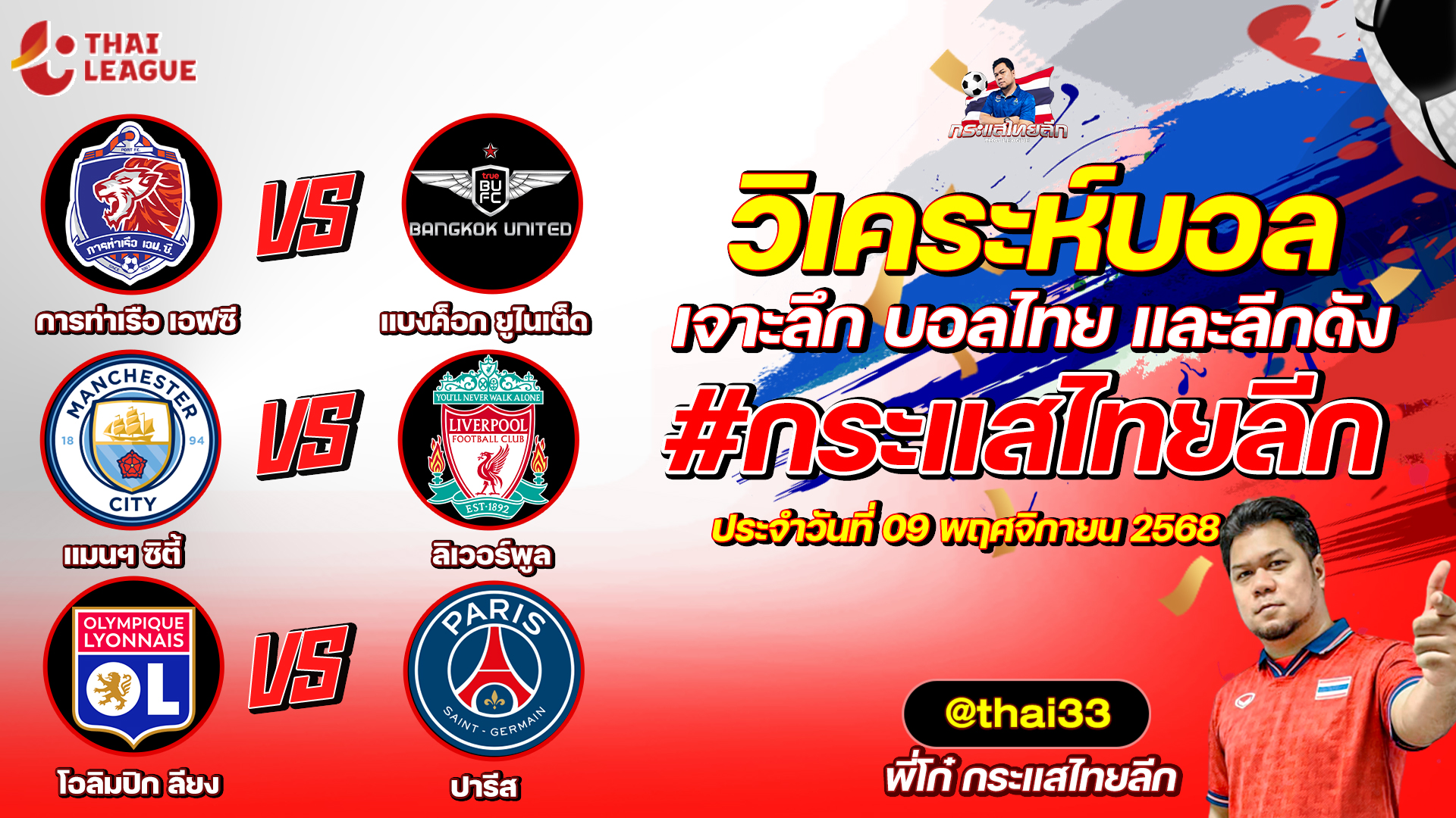 กระแสไทยลีก ทรรศนะบอล 3 คู่ ประจำวันที่ 09/11/2568 รับกระแสไทยลีก ทีเด็ดบอลวันนี้ ทีเด็ดบอลไทย ทรรศนะบอล 3 คู่ กับ พี่โก๋บอลไทย ได้ทุกวันที่ ช่อง กระแสไทยลีก ทีเด็ดบอล 3 คู๋ หน้ากล้อง | วันอาทิตย์ ที่ 09 พฤศจิกายน 2568 ▁▁▁▁▁▁▁▁▁▁▁▁▁▁▁▁▁▁▁▁▁▁▁ 00:20 | การท่าเรือ เอฟซี VS แบงค็อก ยูไนเต็ด 01:45 WEB ADMIN 9 พฤศจิกายน 2025