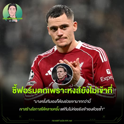 นาเกลส์มันน์ป้อง “เวียร์ตซ์” ชี้ฟอร์มตกเพราะลิเวอร์พูลยังไม่เข้าที่ ⚽️ นาเกลส์มันน์ป้อง “เวียร์ตซ์” ชี้ฟอร์มตกเพราะลิเวอร์พูลยังไม่เข้าที่ ยูเลี่ยน นาเกลส์มันน์ กุนซือทีมชาติเยอรมนี ออกโรงปกป้อง ฟลอเรียน เวียร์ตซ์ หลังถูกวิจารณ์หนักเรื่องฟอร์มตกกับลิเวอร์พูล บอกชัด “ไม่ใช่ความผิดของเขาคนเดียว” แข้งวัย 22 ปีย้ายจากเลเวอร์คูเซ่นมาด้วยค่าตัว 116 ล้านปอนด์ แต่ยังไม่มีทั้งประตูและแอสซิสต์จาก 11 เกมพรีเมียร์ลีก ซึ่งทำให้ถูกจับตาหนัก โดยเฉพาะหลังเกมแพ้แมนฯ ซิตี้ 0-3 นาเกลส์มันน์ เผยว่า “ตอนนี้สโมสรยังไม่มั่นคงเท่าปีก่อน มันเลยยากที่ ฟลอ จะปรับตัวได้เร็ว WEB ADMIN 11 พฤศจิกายน 2025