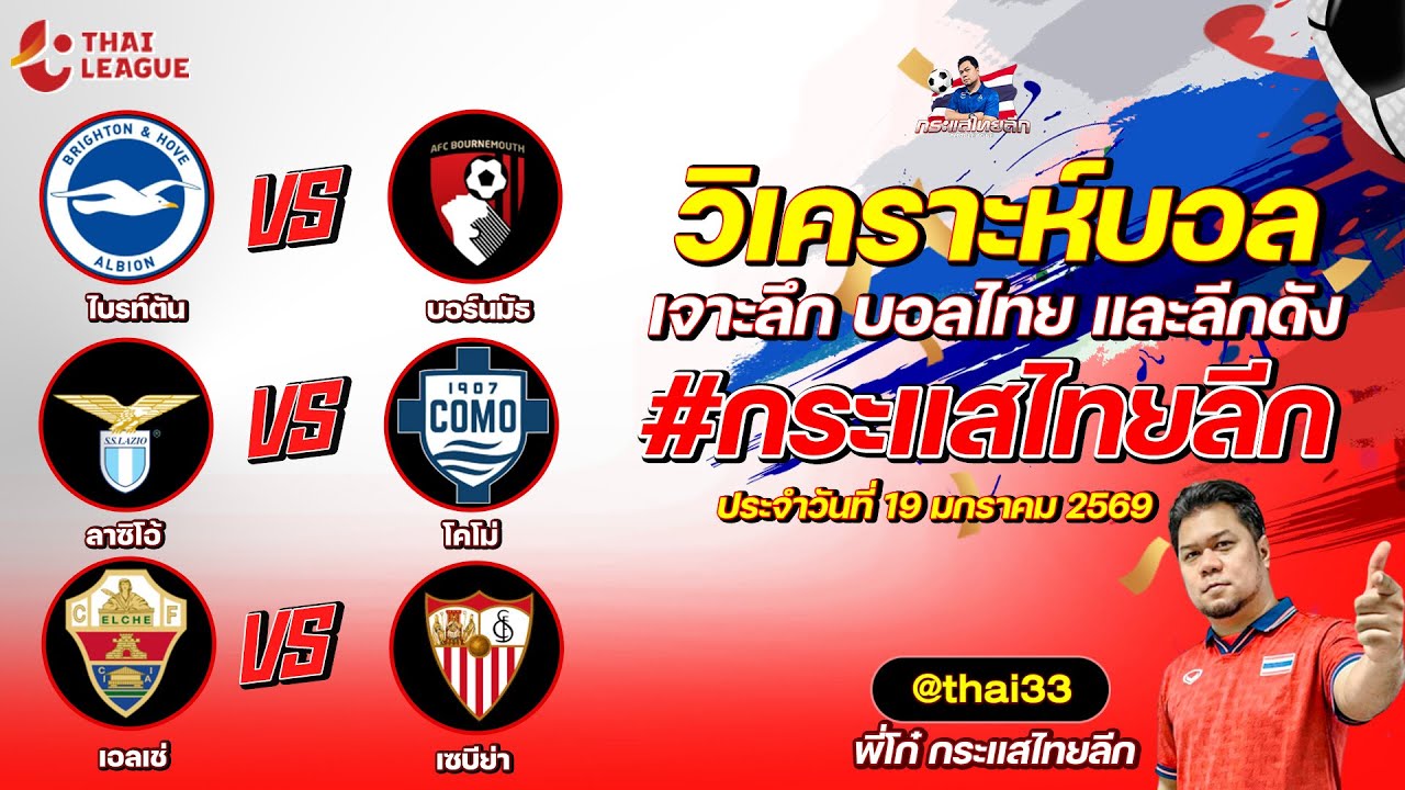 กระแสไทยลีก ทรรศนะบอล 3 คู่ ประจำวันที่ 19/01/2569 รับกระแสไทยลีก ทีเด็ดบอลวันนี้ ทีเด็ดบอลไทย ทรรศนะบอล 3 คู่ กับ พี่โก๋บอลไทย ได้ทุกวันที่ ช่อง กระแสไทยลีก ทีเด็ดบอล 3 คู๋ หน้ากล้อง | วันจันทร์ ที่ 19 มกราคม 2569 ▁▁▁▁▁▁▁▁▁▁▁▁▁▁▁▁▁▁▁▁▁▁▁ 01:00 | ไบรท์ตัน VS บอร์นมัธ 02:07 | ลาซิโอ้ WEB ADMIN 19 มกราคม 2026