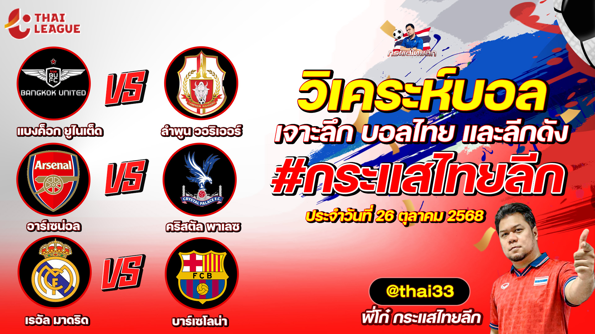กระแสไทยลีก ทรรศนะบอล 3 คู่ ประจำวันที่ 26/10/2568 รับกระแสไทยลีก ทีเด็ดบอลวันนี้ ทีเด็ดบอลไทย ทรรศนะบอล 3 คู่ กับ พี่โก๋บอลไทย ได้ทุกวันที่ ช่อง กระแสไทยลีก ทีเด็ดบอล 3 คู๋ หน้ากล้อง | วันอาทิตย์ ที่ 26 ตุลาคม 2568 ▁▁▁▁▁▁▁▁▁▁▁▁▁▁▁▁▁▁▁▁▁▁▁ 00:39 | แบงค็อก ยูไนเต็ด VS ลำพูน วอริเออร์ WEB ADMIN 26 ตุลาคม 2025