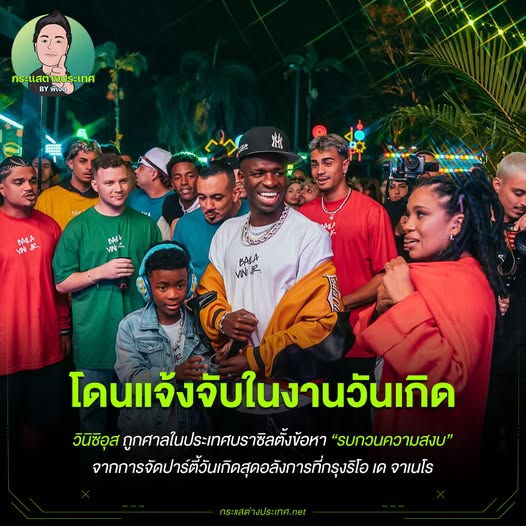 วินิซิอุส โดนฟ้อง! วินิซิอุส โดนฟ้อง! เหตุจัดปาร์ตี้วันเกิดหรู เสียงดังรบกวนเพื่อนบ้าน วินิซิอุส จูเนียร์ เจอเรื่องไม่จบ หลังถูกศาลในประเทศบราซิลตั้งข้อหา “รบกวนความสงบ” จากการจัดปาร์ตี้วันเกิดสุดอลังการที่กรุงริโอ เด จาเนโร งานฉลองครบรอบ 25 ปีของเขาจัดขึ้นตั้งแต่วันที่ 19-21 กรกฎาคม ที่คฤหาสน์หรูระดับงานแต่ง มีทั้ง คอนเสิร์ตของ Travis Scott, พลุไฟ, และเครื่องเล่นเหมือนสวนสนุก! แต่ความสนุกนี้กลับสร้างปัญหาให้เพื่อนบ้านที่ร้องเรียนว่าเสียงดังรบกวนจนต้องโทรแจ้งตำรวจให้เข้ามาระงับเหตุแม้เจ้าหน้าที่จะเข้าขอให้ลดเสียงลง และ วินิซิอุส พร้อมแขกกว่า 500 คน (รวมถึง คามาวิงก้า และนักร้องชื่อดัง WEB ADMIN 16 ตุลาคม 2025
