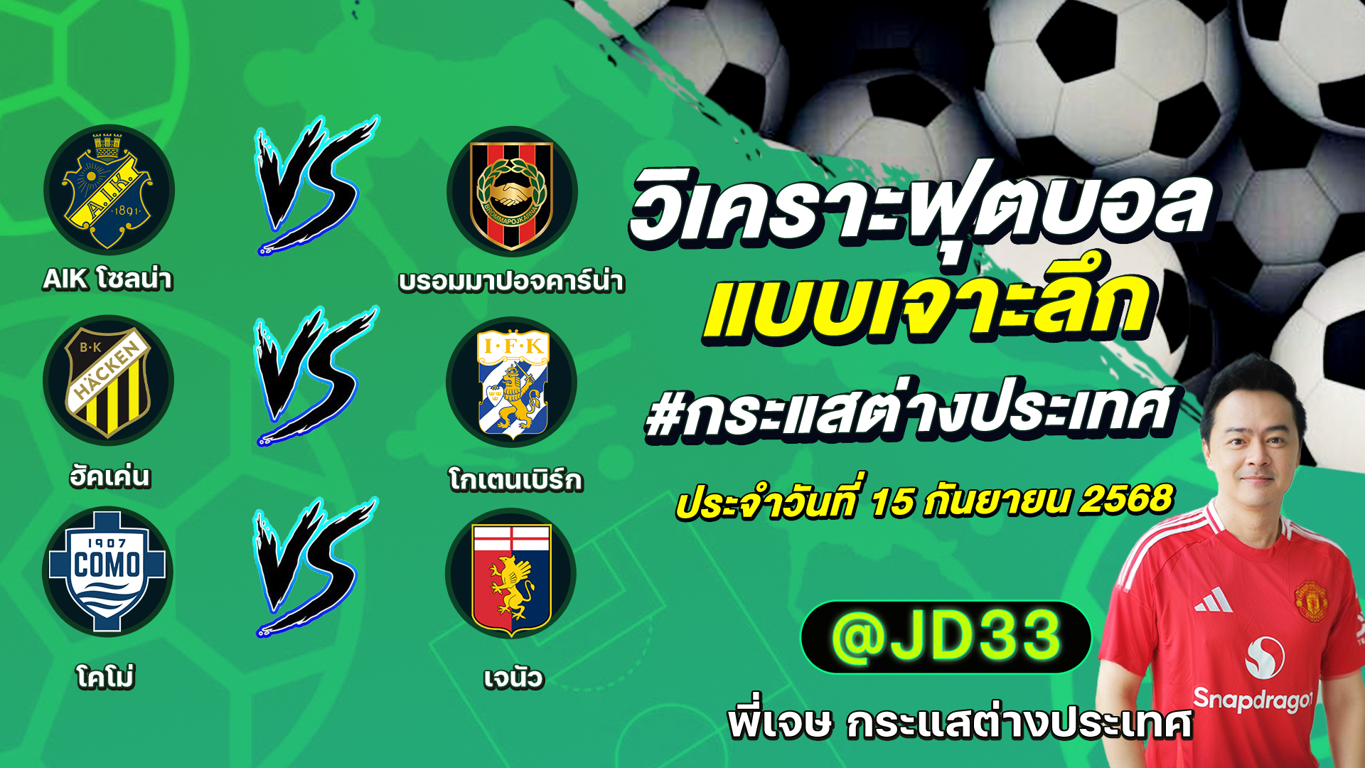 วิเคราะห์บอล กระแสต่างประเทศ 3 คู่ ประจำวันที่ 15/09/2568 รับ ทีเด็ดบอลวันนี้ ทีเด็ดบอลเต็ง ทรรศนะบอล 3 คู่ กับ พี่เจษ กระแสต่างประเทศ ได้ทุกวันที่นี่ที่เดียว ทีเด็ดบอล 3 คู่ หน้ากล้อง | วันอาทิตย์ ที่ 14 กันยายน 2568 ▁▁▁▁▁▁▁▁▁▁▁▁▁▁▁▁▁▁▁▁▁▁▁ 00:19 | AIK โซลน่า VS บรอมมาปอจคาร์น่า 01:00 | WEB ADMIN 15 กันยายน 2025