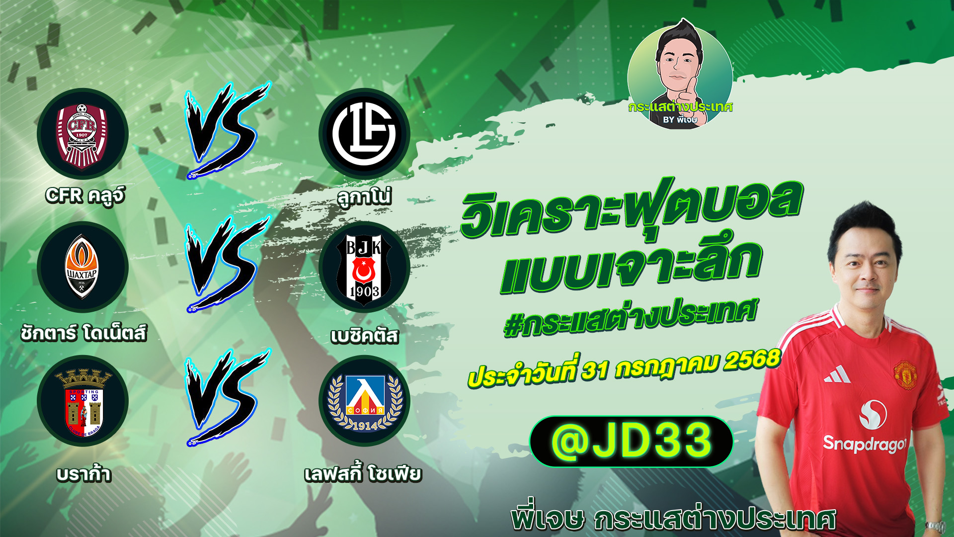 วิเคราะห์บอล กระแสต่างประเทศ 3 คู่ ประจำวันที่ 31/07/2568 รับ ทีเด็ดบอลวันนี้ ทีเด็ดบอลเต็ง ทรรศนะบอล 3 คู่ กับ พี่เจษ กระแสต่างประเทศ ได้ทุกวันที่นี่ที่เดียว ทีเด็ดบอล 3 คู่ หน้ากล้อง | วันพฤหัสบดี ที่ 31 กรกฎาคม 2568 ▁▁▁▁▁▁▁▁▁▁▁▁▁▁▁▁▁▁▁▁▁▁▁ 00:21 | CFR คลูจ์ VS ลูกาโน่ 01:06 | WEB ADMIN 31 กรกฎาคม 2025