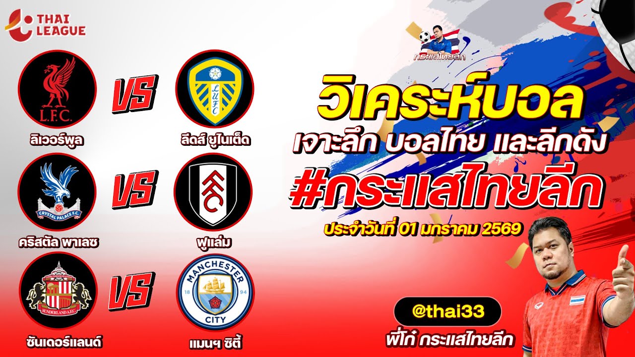 วิเคราะห์บอล กระแสต่างประเทศ 3 คู่ ประจำวันที่ 01/01/2569 รับกระแสไทยลีก ทีเด็ดบอลวันนี้ ทีเด็ดบอลไทย ทรรศนะบอล 3 คู่ กับ พี่โก๋บอลไทย ได้ทุกวันที่ ช่อง กระแสไทยลีก ทีเด็ดบอล 3 คู๋ หน้ากล้อง | วันพฤหัสบดี ที่ 01 มกราคม 2569 ▁▁▁▁▁▁▁▁▁▁▁▁▁▁▁▁▁▁▁▁▁▁▁ 00:47 | ลิเวอร์พูล VS ลีดส์ ยูไนเต็ด 02:07 | WEB ADMIN 1 มกราคม 2026