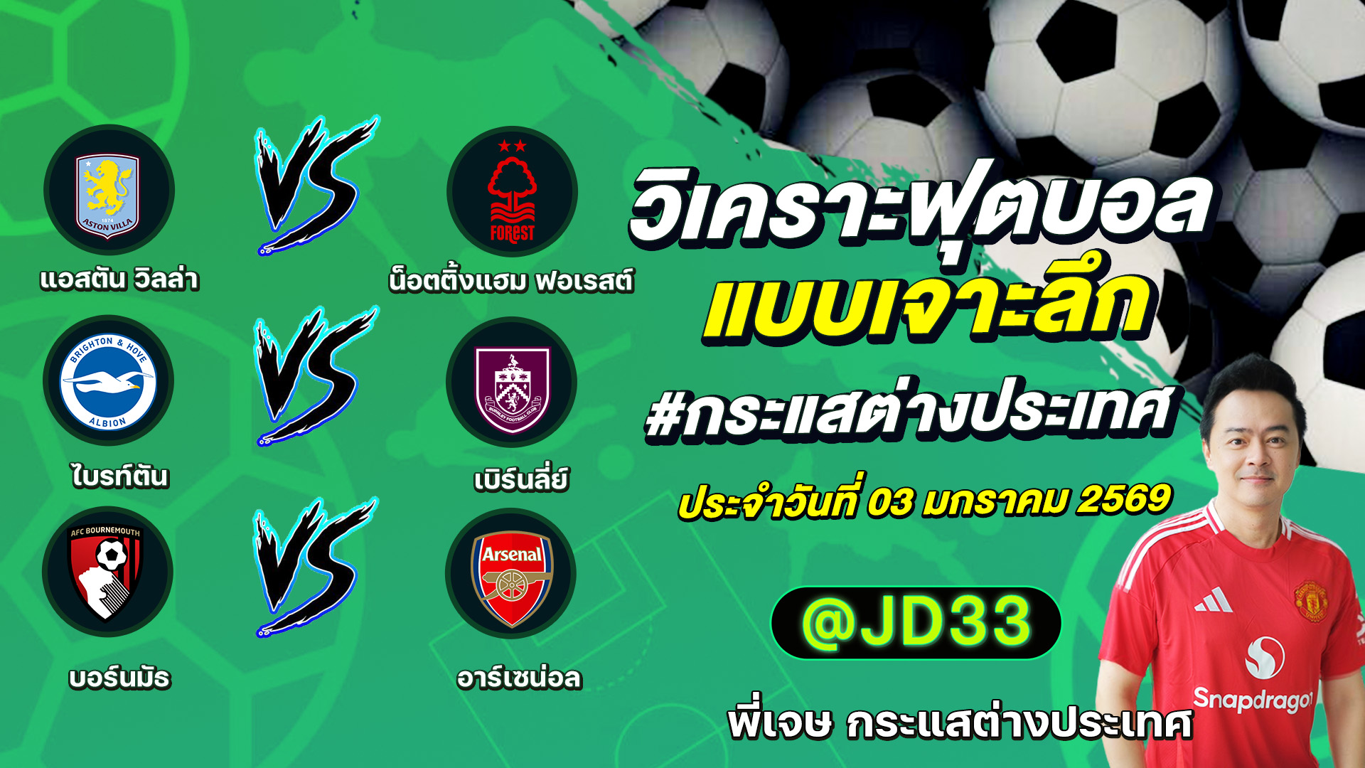 กระแสไทยลีก ทรรศนะบอล 3 คู่ ประจำวันที่ 03/01/2569 รับกระแสไทยลีก ทีเด็ดบอลวันนี้ ทีเด็ดบอลไทย ทรรศนะบอล 3 คู่ กับ พี่โก๋บอลไทย ได้ทุกวันที่ ช่อง กระแสไทยลีก ทีเด็ดบอล 3 คู๋ หน้ากล้อง | วันเสาร์ ที่ 03 ธันวาคม 2569 ▁▁▁▁▁▁▁▁▁▁▁▁▁▁▁▁▁▁▁▁▁▁▁ 00:16 | บอร์นมัธ VS อาร์เซน่อล 01:35 | WEB ADMIN 3 มกราคม 2026