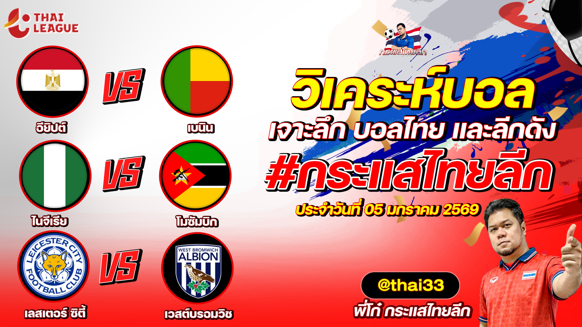 กระแสไทยลีก ทรรศนะบอล 3 คู่ ประจำวันที่ 05/01/2569 รับกระแสไทยลีก ทีเด็ดบอลวันนี้ ทีเด็ดบอลไทย ทรรศนะบอล 3 คู่ กับ พี่โก๋บอลไทย ได้ทุกวันที่ ช่อง กระแสไทยลีก ทีเด็ดบอล 3 คู๋ หน้ากล้อง | วันจันทร์ ที่ 05 มกราคม 2568 ▁▁▁▁▁▁▁▁▁▁▁▁▁▁▁▁▁▁▁▁▁▁▁ 00:18 | อียิปต์ VS เบนิน 01:41 | WEB ADMIN 5 มกราคม 2026