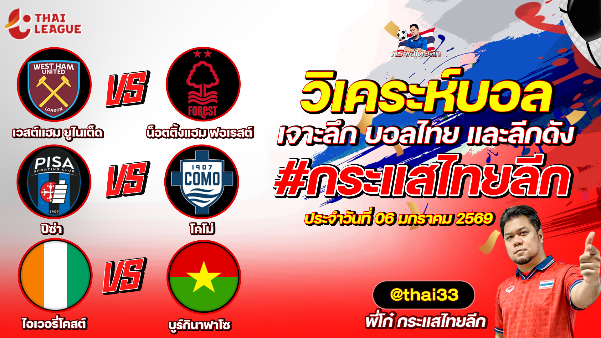 กระแสไทยลีก ทรรศนะบอล 3 คู่ ประจำวันที่ 06/01/2569 รับกระแสไทยลีก ทีเด็ดบอลวันนี้ ทีเด็ดบอลไทย ทรรศนะบอล 3 คู่ กับ พี่โก๋บอลไทย ได้ทุกวันที่ ช่อง กระแสไทยลีก ทีเด็ดบอล 3 คู๋ หน้ากล้อง | วันอังคาร ที่ 06 มกราคม 2568 ▁▁▁▁▁▁▁▁▁▁▁▁▁▁▁▁▁▁▁▁▁▁▁ 00:21 | เวสต์แฮม ยูไนเต็ด VS น็อตติ้งแฮม ฟอเรสต์ 01:32 WEB ADMIN 6 มกราคม 2026