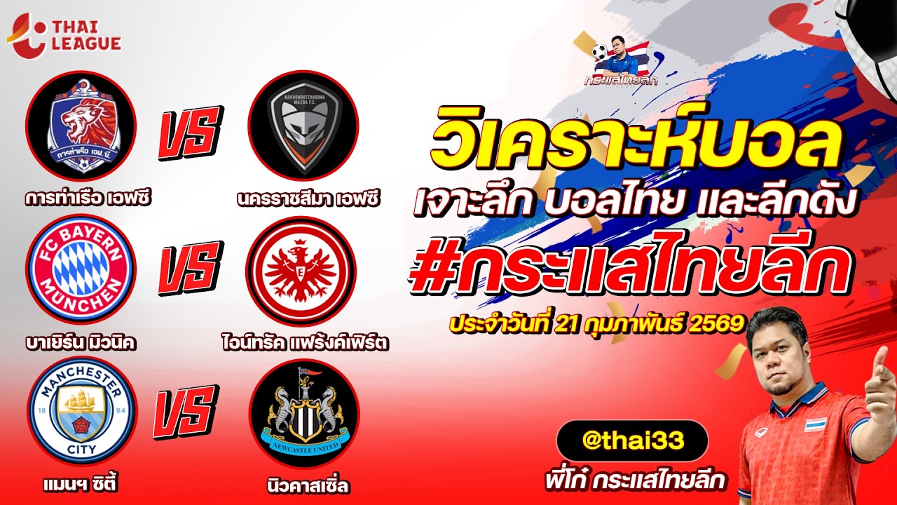 กระแสไทยลีก ทรรศนะบอล 3 คู่ ประจำวันที่ 21/02/2569 รับกระแสไทยลีก ทีเด็ดบอลวันนี้ ทีเด็ดบอลไทย ทรรศนะบอล 3 คู่ กับ พี่โก๋บอลไทย ได้ทุกวันที่ ช่อง กระแสไทยลีก ทีเด็ดบอล 3 คู๋ หน้ากล้อง | วันเสาร์ ที่ 21 กุมภาพันธ์ 2569 ▁▁▁▁▁▁▁▁▁▁▁▁▁▁▁▁▁▁▁▁▁▁▁ 00:48 | การท่าเรือ เอฟซี VS นครราชสีมา เอฟซี WEB ADMIN 21 กุมภาพันธ์ 2026