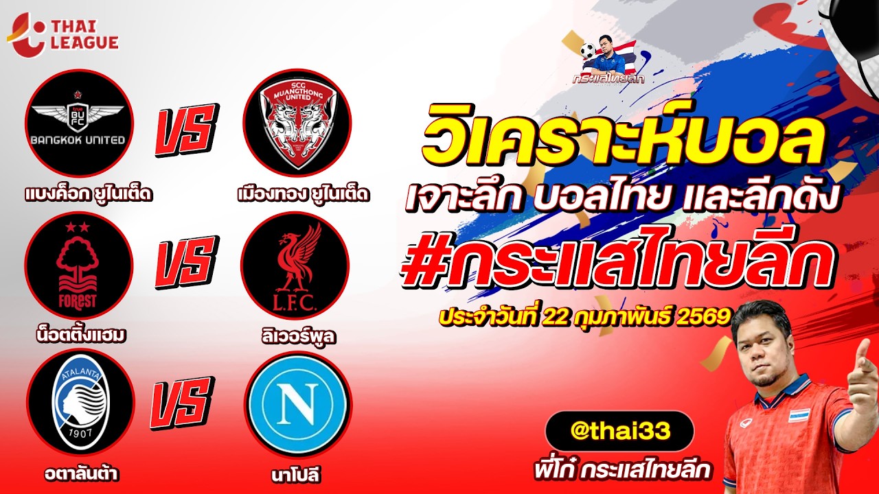 กระแสไทยลีก ทรรศนะบอล 3 คู่ ประจำวันที่ 22/02/2569 รับกระแสไทยลีก ทีเด็ดบอลวันนี้ ทีเด็ดบอลไทย ทรรศนะบอล 3 คู่ กับ พี่โก๋บอลไทย ได้ทุกวันที่ ช่อง กระแสไทยลีก ทีเด็ดบอล 3 คู๋ หน้ากล้อง | วันอาทิตย์ ที่ 22 กุมภาพันธ์ 2569 ▁▁▁▁▁▁▁▁▁▁▁▁▁▁▁▁▁▁▁▁▁▁▁ 00:28 | แบงค็อก ยูไนเต็ด VS เมืองทอง ยูไนเต็ด WEB ADMIN 22 กุมภาพันธ์ 2026