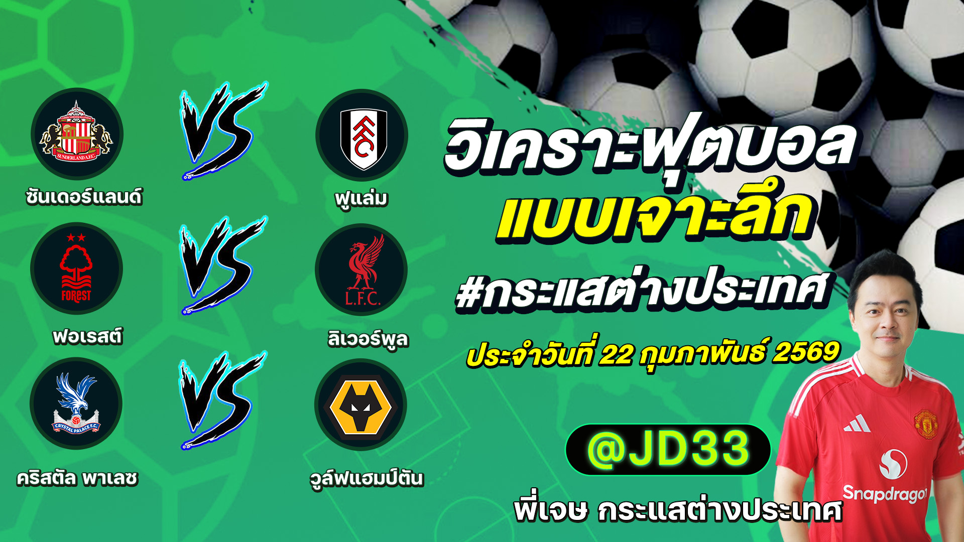 วิเคราะห์บอล กระแสต่างประเทศ 3 คู่ ประจำวันที่ 22/02/2569 รับ ทีเด็ดบอลวันนี้ ทีเด็ดบอลเต็ง ทรรศนะบอล 3 คู่ กับ พี่เจษ กระแสต่างประเทศ ได้ทุกวันที่นี่ที่เดียว ทีเด็ดบอล 3 คู่ หน้ากล้อง | วันอาทิตย์ ที่ 22 กุมภาพันธ์ 2569 ▁▁▁▁▁▁▁▁▁▁▁▁▁▁▁▁▁▁▁▁▁▁▁ 00:19 | ซันเดอร์แลนด์ VS ฟูแล่ม 01:11 | น็อตติ้งแฮม WEB ADMIN 22 กุมภาพันธ์ 2026