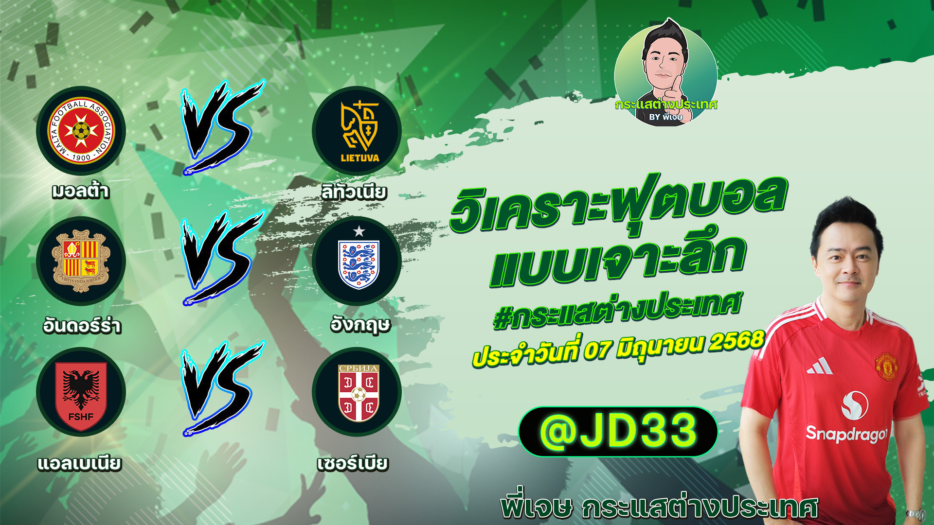 วิเคราะห์บอล กระแสต่างประเทศ 3 คู่ ประจำวันที่07/06/2568 รับ ทีเด็ดบอลวันนี้ ทีเด็ดบอลเต็ง ทรรศนะบอล 3 คู่ กับ พี่เจษ กระแสต่างประเทศ ได้ทุกวันที่นี่ที่เดียว ทีเด็ดบอล 3 คู่ หน้ากล้อง | วันเสาร์ ที่ 07 มิถุนายน 2568 ▁▁▁▁▁▁▁▁▁▁▁▁▁▁▁▁▁▁▁▁▁▁▁ 00:23 | มอลต้า VS ลิทัวเนีย 01:12 | อันดอร์ร่า WEB ADMIN 7 มิถุนายน 2025