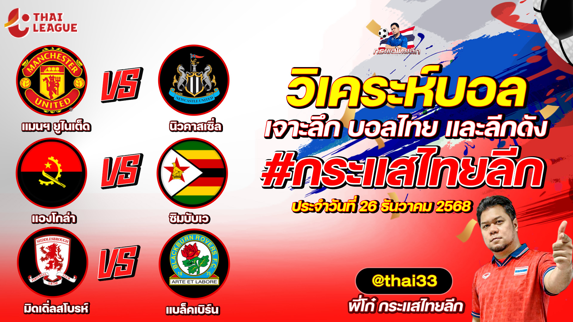 กระแสไทยลีก ทรรศนะบอล 3 คู่ ประจำวันที่ 26/12/2568 รับกระแสไทยลีก ทีเด็ดบอลวันนี้ ทีเด็ดบอลไทย ทรรศนะบอล 3 คู่ กับ พี่โก๋บอลไทย ได้ทุกวันที่ ช่อง กระแสไทยลีก ทีเด็ดบอล 3 คู๋ หน้ากล้อง | วันศุกร์ ที่ 26 ธันวาคม 2568 ▁▁▁▁▁▁▁▁▁▁▁▁▁▁▁▁▁▁▁▁▁▁▁ 00:30 | แมนฯ ยูไนเต็ด VS นิวคาสเซิ่ล 01:49 WEB ADMIN 26 ธันวาคม 2025