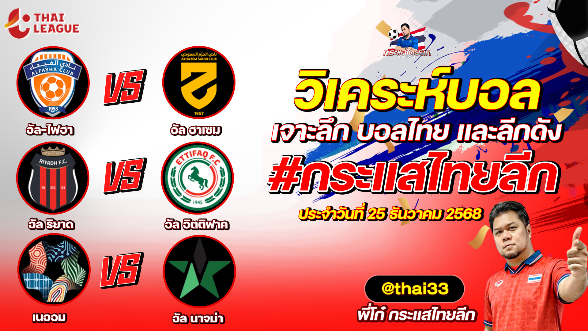 กระแสไทยลีก ทรรศนะบอล 3 คู่ ประจำวันที่ 25/12/2568 รับกระแสไทยลีก ทีเด็ดบอลวันนี้ ทีเด็ดบอลไทย ทรรศนะบอล 3 คู่ กับ พี่โก๋บอลไทย ได้ทุกวันที่ ช่อง กระแสไทยลีก ทีเด็ดบอล 3 คู๋ หน้ากล้อง | วันพฤหัสบดี ที่ 25 ธันวาคม 2568 ▁▁▁▁▁▁▁▁▁▁▁▁▁▁▁▁▁▁▁▁▁▁▁ 00:28 | อัล-ไฟฮา VS อัล ฮาเซม 02:13 | WEB ADMIN 25 ธันวาคม 2025